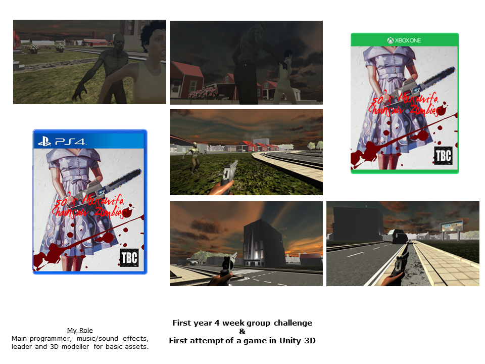 This is another of the first 3D Unity projects that I took part in creating. This is more of a narrative focused game about Zombies in a 1950’s world. My roles in this group project were Lead Programmer using JavaScript, Music production and Producer. This game was created in 3-4 weeks.